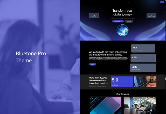 $ 59.99The WordPress Block Theme Bluetone is designed to grow your business with full site editor features under a GPL license. Complete your purchase to receive the theme via email, along with a step-by-step tutorial.
